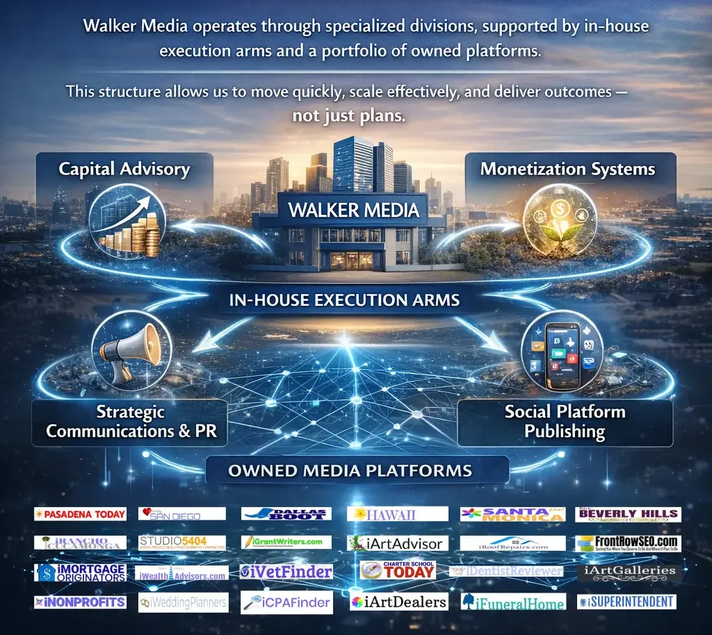 Walker Media operates through specialized divisions, supported by in-house execution arms and a portfolio of owned platforms.